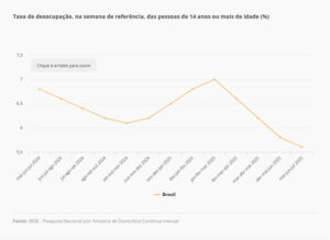 Desemprego cai a 5,6% no trimestre encerrado em julho – A taxa de desemprego do trimestre móvel encerrado em julho de 2025 caiu para 5,6% — a menor da série histórica do indicador, iniciada em 2012. No trimestre, a população desocupada caiu para 6,118 milhões, o menor contingente desde o último trimestre de 2013 (6,1 milhões). Estes são alguns dos destaques da Pesquisa Nacional por Amostra de Domicílios (Pnad) Contínua, divulgada nesta terça-feira, 16 de setembro, pelo Instituto Brasileiro de Geografia e Estatística (IBGE).